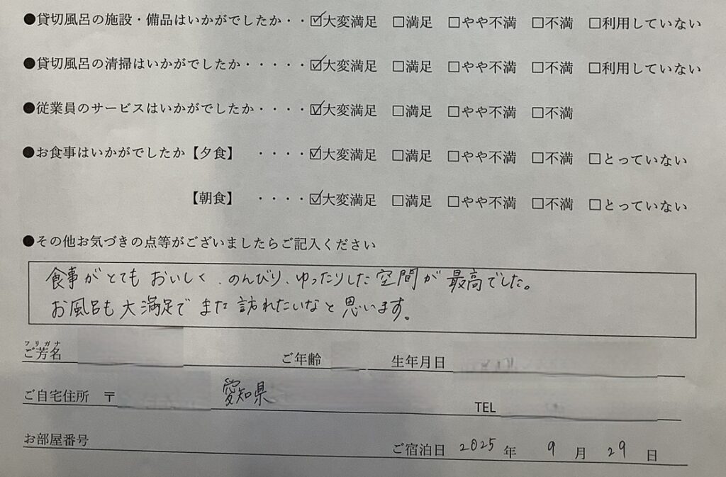 「食事がとてもおいしく、のんびり、ゆったりした空間が最高でした。お風呂も大満足でまた訪れたいなと思います。」