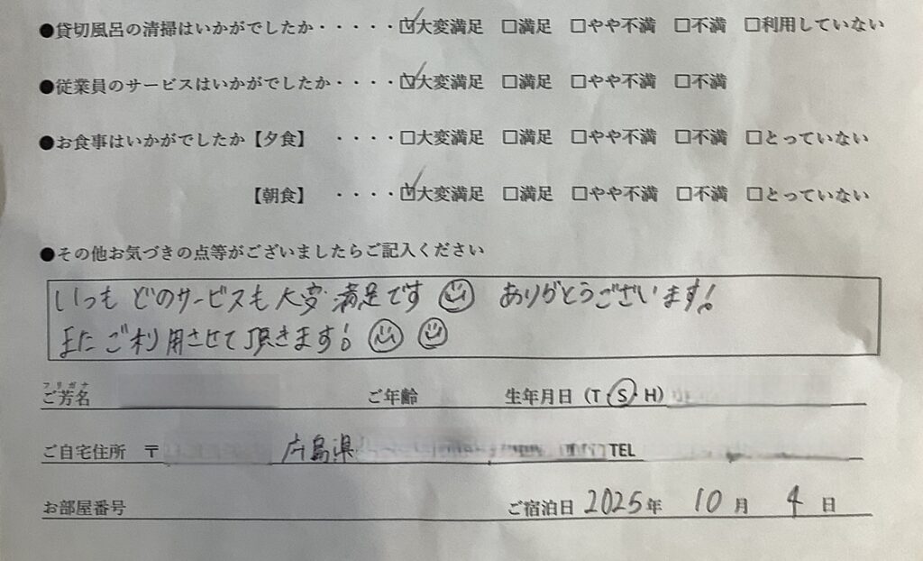 またのご利用を心よりお待ちしております。今後も、より一層ご期待に添えるよう努めてまいります。