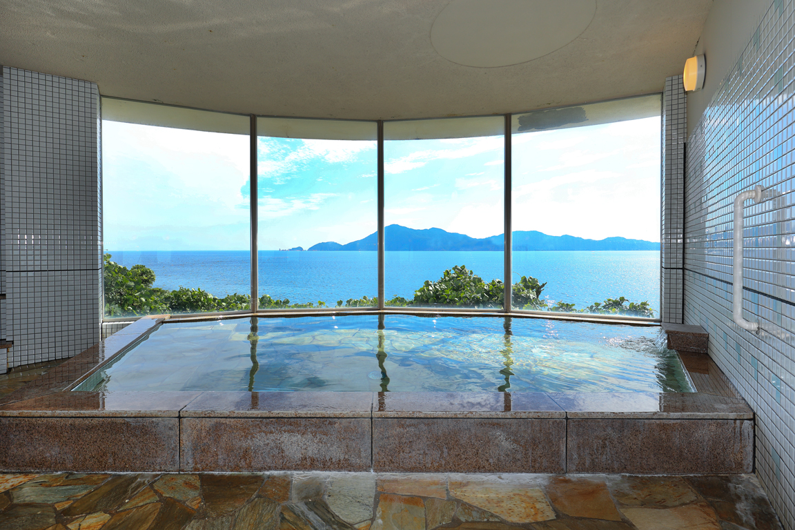 日本海の絶景を一望できる、北長門国定公園の高台に位置するリトリートホテル「悠久の季」。 大浴場では、その美しい景色を眺めながら至福の時を過ごすことができます。